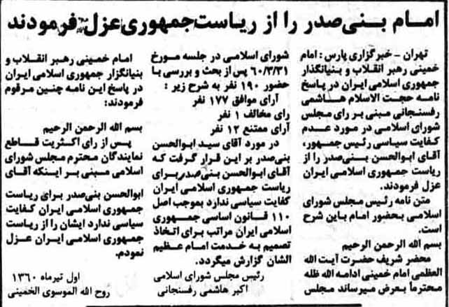 جمهوری اسلامی ایران عزل نمودم. روح الله موسوی الخمینی، اول تیرماه 1360