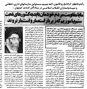 ایت الله خامنه ای، رئیس جمهور وقت در سفری که به مناسبت شرکت در مراسم یادبود شهدای هفتم تیر به اصفهان داشتند، طی مصاحبه ای به محبت ویژه ای که بین مسئولین و مردم به وجود آمده است اشاره و در اظهار نظری صادقانه در تشریح وضعیت ادارات دولتی می فرمایند: «من اعتراف می کنم که وضع ادارات ما مناسب با خواسته های مردم نیست، در ضمن کمبود ها و سختیها در میان کارمندان دولت بلسیار زیاد است اما از حق مردم هم نمی توان گذشت، با همه مشکلات بسازیم» ایشان در ادمه به لزوم اتحاد بین معممین و پاسداران اشاره و بر لزوم رسیدگی به حال مردم تاکید می کنند.