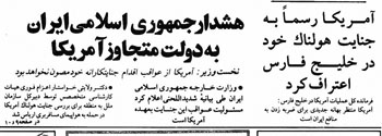 هفته دوم تیرماه سال 1367، بحث حمله نظامی آمریکا به هواپیمای مسافربری ایران در محافل خبری مطرح است. مقامات جمهوری اسلامی ایران، با واکنش تندی آمریکا را مسئول مستقیم جنایت مزبور می دانند. میرحسین موسوی، نخست وزیر، در اظهار نظری انقلابی اظهار می دارد:«آمریکا از عواقب اقدام جنایتکارانه خود مصون نخواهد بود» دکتر ولایتی، خواستار اعزام فوری هیات کارشناسی متخصص توسط دبیر کل سازمان ملل به منطقه برای بررسی وضعت می شود.