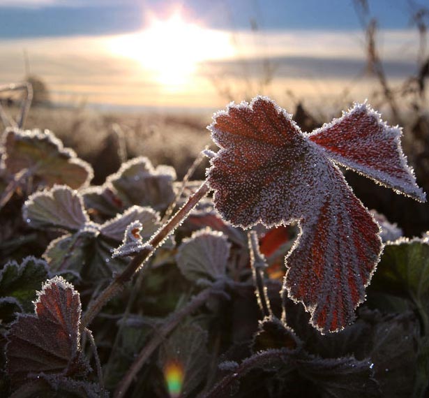 قطرات شبنم منجمد شده روی برگ در باغی در آلمان