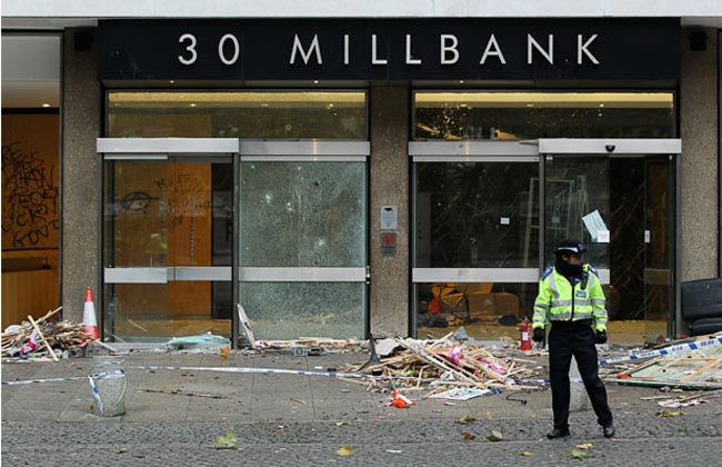 حمله دانشجویان معترض و خشمگین بریتانیایی به دفتر حزب حاکم محافظه کار در لندن در اعتراض به سیاستهای مالی دولت دیوید کامرون