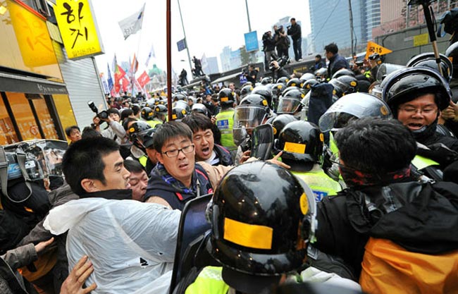 درگیری معترضان کره ای به نشست رهبران جی بیست با پلیس کره در سئول