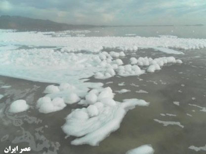 وسط های دریاچه ، هنوز کمی آب وجود دارد که این روزها با پدیده عجیبی روبرو شده : دریاچه کف کرده است!