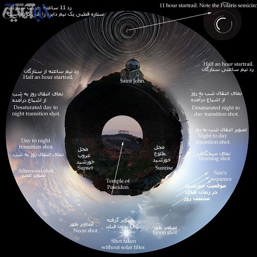به گزارش باشگاه خبرنگاران به نقل از لارپوبلیکا، کریس کوتسیوپلوس، عکاس نجومی یونانی این تصویر شگفتانگیز کروی پانوراما را از دماغه سوینو واقع در 100 کیلومتری جنوبغربی آتن، پایتخت یونان گرفته است. این تصویر کروی پانوراما در طول 24 ساعت گرفته شده و در مجموع حاصل ترکیب 35 تصویر از خورشید و 25 تصویر از مناظر است.