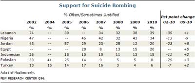 به طور كلي حدود 20 درصد از مردم مصر از انجام چنين عمليات هايي حمايت مي كنند و 80 درصد اعلام كرده اند كه اين كار عمل درستي نيست : 8 درصد از مردم مصر گفته اند كه اغلب اوقات اين نوع اقدام را درست مي دانند ، 12 درصد از مردم مصر گفته اند كه گاهي اوقات اين نوع عمليات درست است ، 34 درصد گفته اند كه اين اقدام تنها به ندرت عمل درستي است و 46 درصد از مردم مصر گفته اند كه عمليات انتحاري را هرگز تاييد نمي كنند.