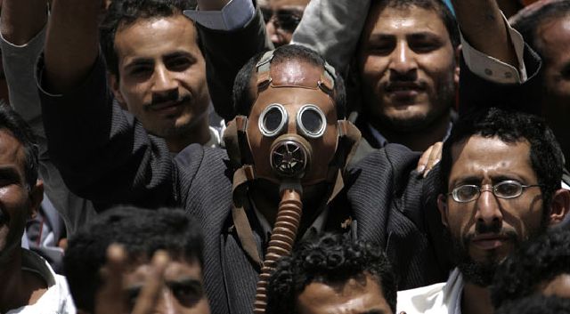 يكي از تظاهرات كنندگان ضد دولت در شهر صنعا در يمن با ماسك گاز شعار بركناري رييس جمهوري از قدرت را سر مي دهد
