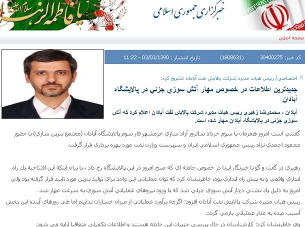 تیتر جالب ایرنا برای خبر کشته و زخمی شدن تعدادی از کارگران در انفجار و آتش سوزی امروز پالایشگاه آبادان همزمان با حضور احمدی نژاد