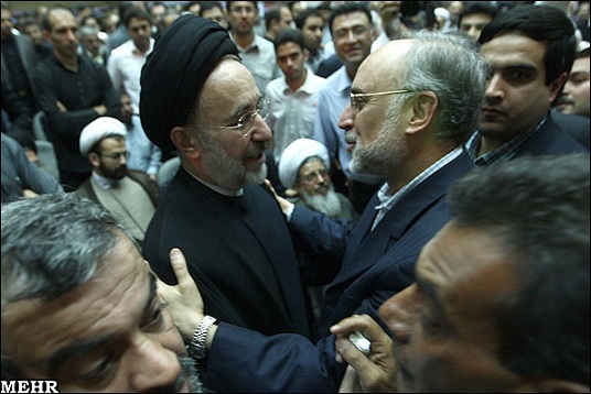مصافحه صالحی وزیر خارجه با خاتمی در مراسم ختم حجت الاسلام محمد علی صدوقی نماینده ولی فقیه و امام جمعه یزد در مسجد نور تهران