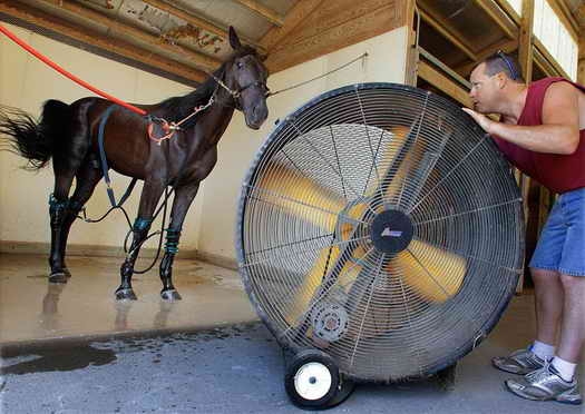 به گزارش خبر گرمای شدید بخش وسیعی از ایالات متحده را در بر گرفته و مایک کاکس برای خنک کردن مادیان زیبا و گرانقیمت خود ، پنکه بزرگی جلوی او قرار داده و لولههای خرطومی آبفشان را به دور مادیان پیچیده است.