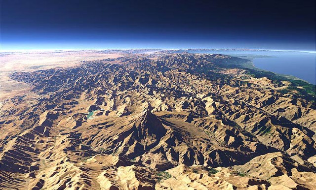 کوه های زاگرس رشتهکوهی در غرب و جنوب ایران است. این رشتهکوه از کرانههای دریاچه وان در کردستان ترکیه آغاز شده و پس از گذشتن از استانهای آذربایجان، کردستان، کرمانشاه و اصفهان و چهارمحال و بختیاری و خوزستان و لرستان تا استانهای فارس و کرمان ادامه مییابد. در این تصویر بخش مرکزی کوه های زاگرس با مرتفع ترین قله را می توان در پس زمینه سمت راست دید در حالی که خلیج فارس در سمت چپ قابل مشاهده است.
