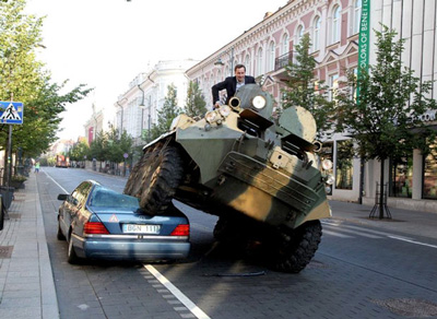 شهردار پايتخت ليتواني در اقدامي تعجب بر انگيز براي مجازات رانندگان خاطي كه اتومبيل هاي خود را در مناطق ممنوعه شهر پارك مي كنند با يك تانك از روي يك مرسدس بنز پارك شده در منطقه خط كشي شده ويژه دوچرخه سواري رد شد و مرسدس بنز را له كرد.