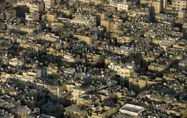 دیشهای ماهواره روی پشت بامهای قدیمی دمشق سوریه
