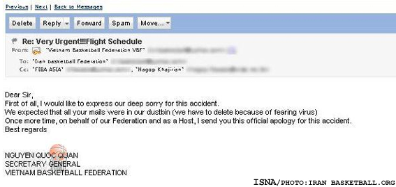 نامه عذر خواهي فدراسيون بسكتبال ويتنام از ايران