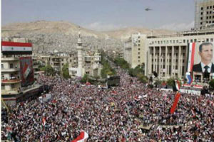 تظاهرکنندگان در شهر دمشق هم اکنون با تجمع در یکی از میادین بزرگ، پرچم چند صدمتری کشورشان را روی دستهای خود دارند و با سردادن شعار، حمایت خود را از نظام سوریه اعلام می کنند.