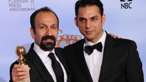 اصغر فرهادي كارگردان و پيمان معادي بازيگر نقش نادر در فيلم جدايي نادر از سيمين يكشنبه شب پس از دريافت جايزه بهترين فيلم خارجي جشنواره گلدن گلوب در لس آنجلس.