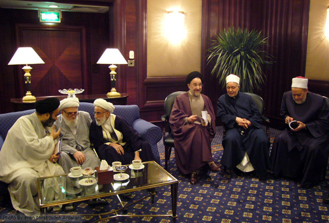 تاریخ ایرانی- این عکس مربوط به سفر سیدمحمد خاتمی رییس جمهور سابق و آیت الله احمد جنتی، دبیر شورای نگهبان به مصر است. این سفر به منظور شرکت در اجلاس بین المللی «دنیای اسلام و جهانی شدن» در فروردین سال ۱۳۸۶ انجام شد. آیت الله تسخیری، دبیرکل مجمع جهانی تقریب مذاهب اسلامی نیز در تصویر دیده می‌شود.