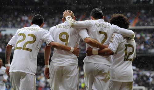 عصر ایران ورزشی - بازیکنان رئال مادرید در بازی امروز رئال و سویا. شاگردان خوزه مورینیو این بازی را با نتیجه 3 بر صفر به خود پایان دادند. از چپ به راست: دی ماریا، بنزما، رونالدو، مارسلو.