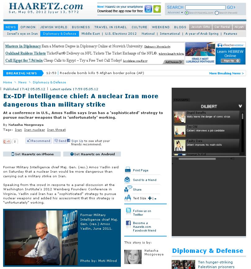 به گزارش جام نیوز، روزنامه صهیونیستی "هاآرتص" (Haaretz) شنبه 16اردیبهشت (May.05) در پایگاه اینترنتی خود نوشت: «‌"عاموس یادلین" رئیس سابق اطلاعات ارتش اسرائیل معتقد است که دستیابی ایران به فناوری هسته‌ای، بسیار خطرناکتر از درگیری نظامی با این کشور است.»