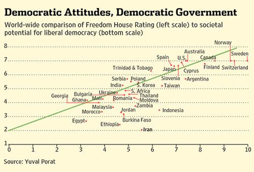 نتایج یک تحقیق بین المللی نشان می دهد که مردم ایران در مقایسه با کشورهای عربی خاورمیانه ، شمال آفریقا و بسیاری از کشورهای اروپای شرقی و آسیایی باور بیشتری نسبت به ارزش های دموکراتیک و مردمسالاری دارند.