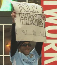 گفته شده که اين بنر را يکي از هواداران به دست ته وز داده و کنايه آن به سخنان سه سال پيش فرگوسن بود. آن زمان از فرگوسن سوال شده بود آيا نمي ترسد که تيمي شگفتي ساز شود و جاي قرمزپوشان را در کورس قهرماني بگيرد؟ سرمربي منچستريونايتد پاسخ داده بود: نه تا زماني که من زنده هستم.