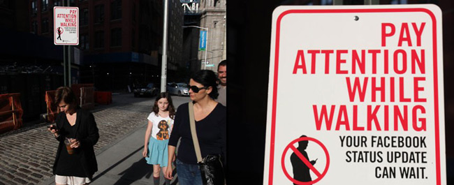 تابلو زیر در شهر نیویورک نصب شده و روی آن نوشته : " به هنگام راه رفتن دقت کنید ، فیسبوک خودتان را می توانید در زمان دیگری نیز چک کنید." این هشدار در پی آن صورت می گیرد که بسیاری از شهروندان از طریق تلفن همراه خود در موقع راه رفتن در خیابان به شبکه های اجتماعی متصل می شوند و این گونه حواس شان ممکن است پرت شده و تصادف کنند.