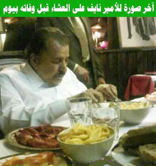 آدم سالم هم اینقدر خوراک بخوره شب پس میوفته چه برسه به این اقای از خدا با خبر که کلکسیون درد بی درمون داشته .خداوند با مرادش ابن تیمیه سلفی وهابی. محشورش کنه. این آقا از عوامل گردن زدن ایرانی های دربند در عربستان بوده و تا زنده بود دشمن درجه یک ایران و شیعه بوده ان شاءالله بهار عربی به صحرای عربستان برسه و سرزمین وحی را از لوث خبائث پاک کنه