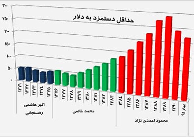 در دوره فعالیت دولت محمود احمدی نژاد از سال 84 تا ابتدای تابستان 91 حداقل ذستمزد از 122 هزار تومان با 218 درصد رشد به 389 هزار تومان رسیده است و ارزش این دستمزد در مقایسه با دلار به نرخ آزاد نشان می دهد که قدرت خرید حداقل دستمزد ماهانه مزد بگیران ایرانی در این دوره از 136 دلار با 124 درصد رشد به 290 دلار در سال 89 رسیده است و بعد از آن طی سال 90 و بهار سال 91 به دلیل افزایش بی رویه قیمت دلار به 221 دلار کاهش یافته است. برآیند تغییرات قدرت خرید حداقل دستمزد تا پایان بهار سال 91 معادل 63 درصد است. شاید بتوان گفت این افت و خیز شدید در قدرت خرید مردم طی دو سال اخیر مبنای اصلی نقد عملکرد دولت محمود احمدی نژاد بین عامه مردم قرار گیرد.
