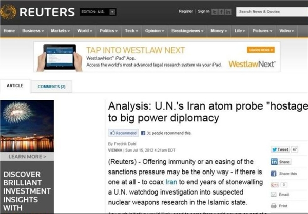 این خبرگزاری نوشت: «مصونیّت دادن به ایران یا کاهش فشار تحریمها شاید تنها راهی باشد ـ اگر اصلا راهی وجود داشته باشد ـ که با آن میتوان ایران را متقاعد کرد تا به سالها مانعتراشی برای ناظران سازمان ملل، که میخواهند از تحقیقات مشکوک به سلاحهای هستهای در این کشور اسلامی بازرسی به عمل آورند، پایان دهد.»