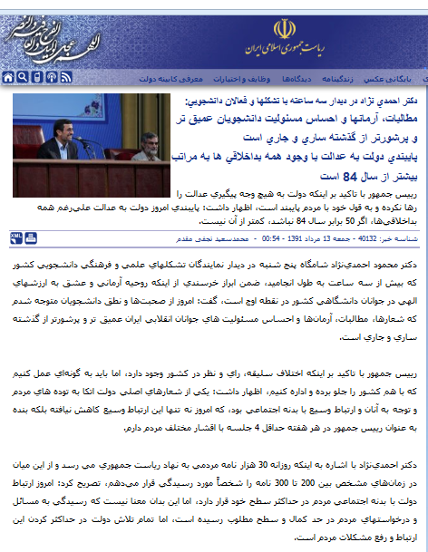 اين را بدانيد كه اگر احمدي نژاد هيچ كاري نكرده باشد و فقط دست يك عده دزد و غارتگر بيت المال را كه ادعاي مالكيت انقلاب را داشتند را كوتاه نمود بزرگترين خدمت به انقلاب و نظام را نموده است و عدالت هم يعني همين كه مفسدان چشم ديدن ان را ندارند.