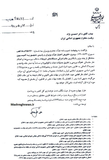 مشرق: رییس مجلس آن بخش از مصوبه هیئت دولت را که تفویض اختیار رییس جمهور