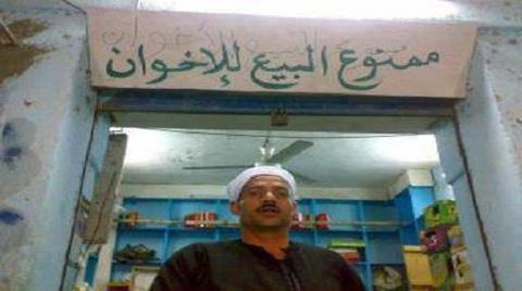 این فروشند مصری، بر روی این تابلو نوشته «ممنوع البيع للإخوان»(فروش کالا به اخوان المسلمین ممنوع است).