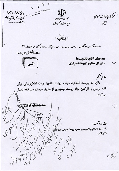 فارس - رئیس مرکز ارتباطات مردمی ریاست جمهوری امروز در نامهای به شماره 1218750 خواستار اطلاعرسانی دبیرخانه مرکزی به منظور حضور کلیه کارکنان نهاد در آئین زیارت عاشورا شد.