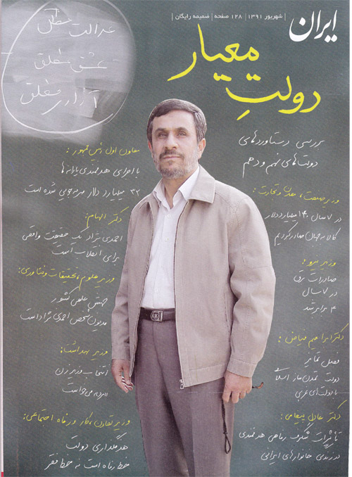 در ویژه نامه "دولت معیار" که توسط روزنامه دولتی ایران منتشر شد سه شعار عدالت مطلق، عشق مطلق و آزادی مطلق به عنوان شعار دولت احمدی نژاد انتخاب شده است.