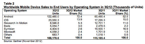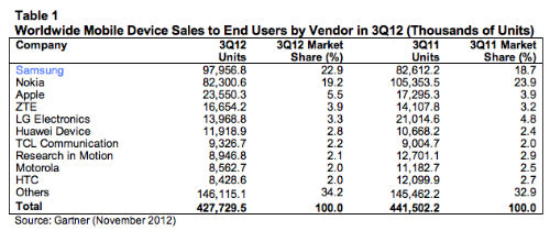 نارنجی: شرکت نوکیا در سه ماهه سوم سال ۲۰۱۲ به رتبه هفتم جدول رتبه بندی فروشندگان برتر اسمارت فون دنیا سقوط کرد. این در حالی است که سامسونگ و اپل همچنان یکه تاز بازار اسمارت فون دنیا بوده و در بالای این جدول ایستاده اند. در گزارش روز چهارشنبه موسسه گارتنر آمده است که نوکیا با فروش 7.2 میلیون دستگاه، یعنی سهم 4.3 درصدی از بازار 169.2 میلیونی فروش اسمارت فون دنیا در فصل سوم ۲۰۱۲، از جایگاه سوم در سه ماهه آوریل تا ژوئن به مکان هفتم سقوط کرده است. البته این شرکت هنوز عنوان دومین فروشنده برتر تلفن همراه دنیا را در اختیار دارد.