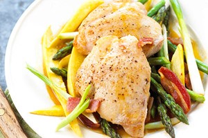 2- در ادامه مارچوبه و 1 استكان آب به این گوشت اضافه كرده و نمك و فلفل را روی آن‌ها پاشیده  و آن‌ها را در ظرف بی خطر برای ماكروویو بریزید و روی آن را با سلفن پلاستیكی بپوشانید. و 100% قدرت برای مدت 3تا 5 دقیقه بپزید تا زمانی كه سبزیجات حلقه شده ترد و نازك شوند و یك بار هم زده و آن را به بشقاب انتقال دهید و سرو كنید.