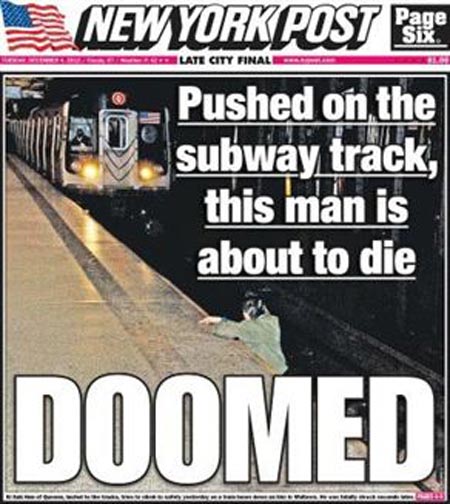 عصر ایران - روزنامه پرتیراژ " نیویورک پست " آمریکا با انتشار عکسی از ثانیه های قبل از مرگ فجیع یک شهروند 58 ساله آمریکایی زیر قطار در یک ایستگاه مترو در نزدیکی میدان تایمز نیویورک، جنجال ساز شد.