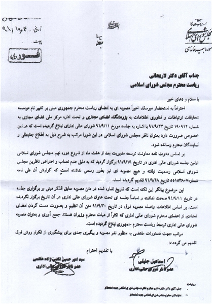 این نامه به امضای اسماعیل جلیلی و سید امیر حسین قاضی‌زاده هاشمی دو عضو ناظر مجلس در شورای عالی اداری رسیده است.