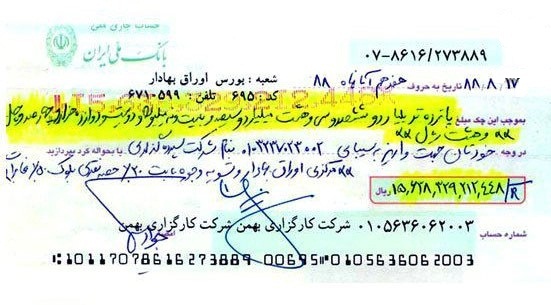 تصوير تاريخي‌ترين چك كشور به ارزش هزار و ۵۶۳ ميليارد تومان مربوط به پرداخت وجه نقد ۲۰ درصدي بلوك ۵۰ درصد بعلاوه يك سهم مخابرات در سال ۱۳۸۸ در بزرگترین معامله تاریخ بورس ایران