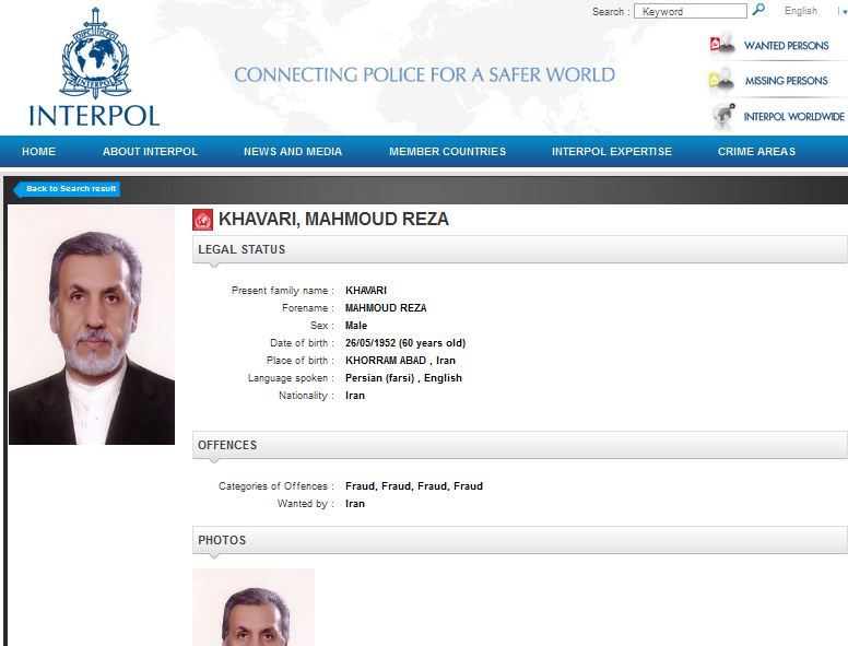 عصر ایران - پلیس بین الملل (اینترپل) با درخواست ایران، محمود خاوری مدیرعامل سابق وفراری بانک ملی ایران را به اتهام "کلاهبرداری "در صفحه افراد تحت تعقیب قرار داده است.