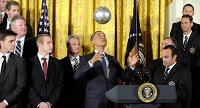 باراک اوباما رییس جمهورآمریکا در مراسم ویژه ای با حضور بازیکنان دو تیم قهرمان فصل گذشته لس انجلس نشان داد درفوتبال هم مهارتهایی دارد.