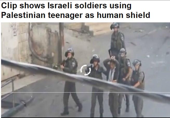 آنها پسرك را با دستان بسته و در حاليكه سرش به زور بالا گرفته اند وادار به ايستادن در كنار شان كرده و شروع به شليك به سوي معترضين فليسطيني مي كنند.