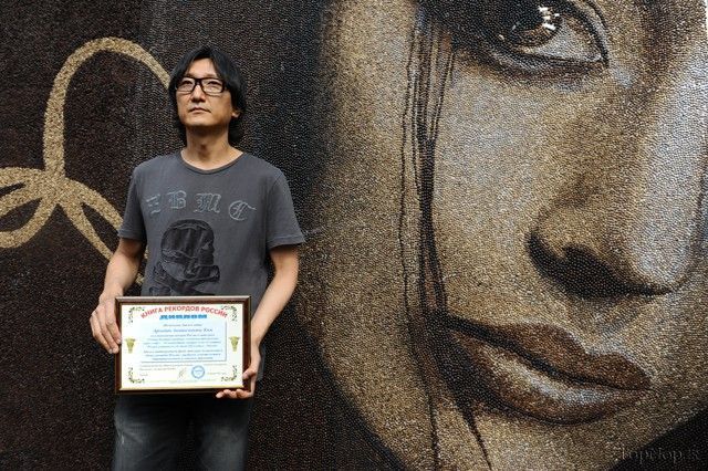 این هنرمند به همراه تیمش به مدت 2 هفته با چیدمان این دانه های قهوه این اثر را به وجود آورده و توانستند رکوردی را در کتاب گینس ثبت کنند .