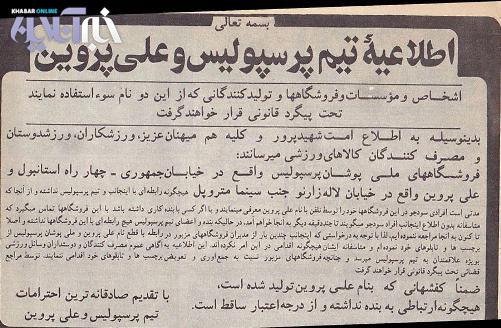 این یک اطلاعیه از سوی علی پروین و باشگاه پرسپولیس در سال های اوایل دهه 60 است که در مجله دنیای ورزش به چاپ رسید.