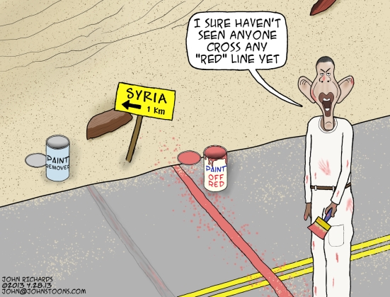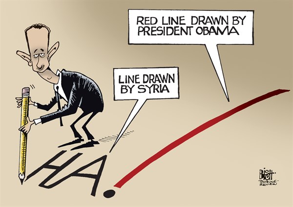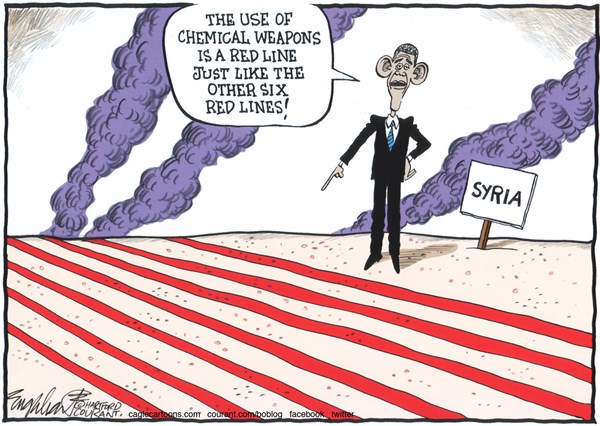 کاریکاتورهای زیرکه در مطبوعات و رسانه های غربی منتشر شده ، نشان می دهد ظاهرا تهدید های اوباما مبنی بر خط قرمز بودن مساله استفاده از سلاح های شیمایی، زیاد جدی گرفته نشده است.