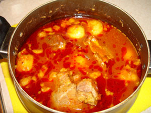در اواخر طبخ ۵ تا ۶ عدد سیب زمینی را پوست گرفته و با کمی نمک ، فلفل و زردچوبه به غذا اضافه کنید .