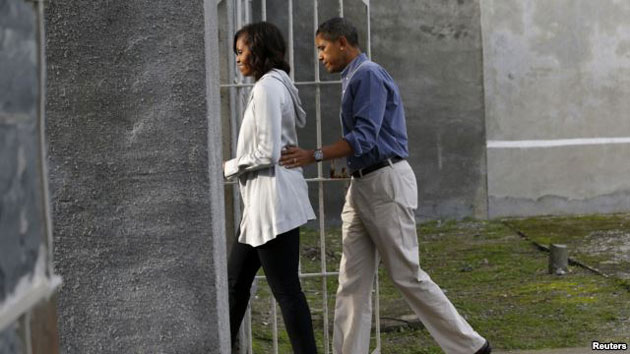 عصر ایران - باراک اوباما رییس جمهور آمریکا در سفر اخیر خود به افریقای جنوبی با حضور در جزیره " روبن" در نزدیکی کیپ تاون از بنایی که بیش از 27 سال محل زندانی انفرادی نلسون ماندلا رهبر مبارزه با تبعیض نژادی و رییس جمهور اسبق این کشور بود ، بازدید کرد.