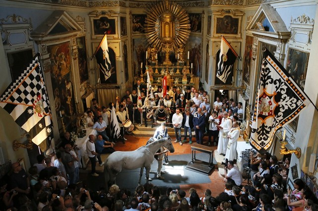 اجرای مراسم متبرک ساختن اسب در کلیسایی در شهر سیه نا  ایتالیا قبل از برگزاری مراسم مسابقه