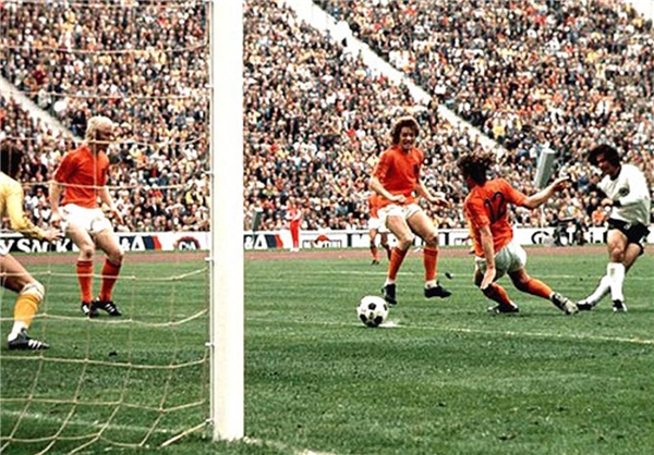 عصر ایران - گرد مولر، مهاجم افسانه ای تیم ملی آلمان، در حال گشودن دروازه هلند در فینال جام جهانی 1974. این مسابقه با برتری 2 بر 1 و آلمان به پایان رسید.