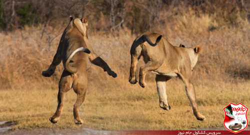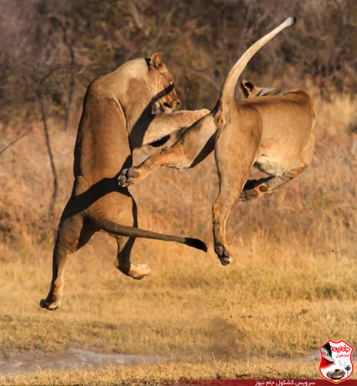 گیوین تانکینسون عکاس این تصاویر می گوید: من تابحال ندیده بودم یک شیر اینقدر به هوا بپرد. به نظر من دعوای این دو ماده شیر بیشتر شبیه به کونگ فو بود.