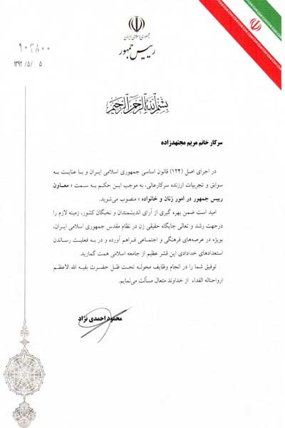 در این حکم که 5 مرداد ماه به امضا رییس جمهور رسیده و 12 مرداد ماه در سایت مرکز امور زنان و خانواده قرار گرفته است، مریم مجتهد زاده به سمت معاون امور زنان و خانواده منصوب شده است.